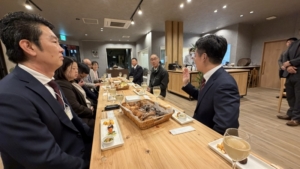 今年度は、奈良市・生駒市で事業を行っている社会福祉法人青葉仁会へお伺いし、榊原典俊理事長からお話を聞かせていただきました。青葉仁会さんは、障がい福祉を主として、入所施設、グループホーム、生活介護、就労継続A・B型等幅広く事業を展開されています。事業の中では、木工品の製造や紙すき、石けん製造、食品加工など、自社ブランドとして販売しているものの他、企業のOEM生産を行っているとのことでした。実際に事業所を視察し、有名企業との取引や海外への輸出まで手がけているとのことで、参加者一同驚きと感嘆の声が聞かれました。また、現在は農福連携にも力を入れておられ、高齢化で大和茶の栽培ができなくなったところにブルーベリーを植え、一般に開放しての収穫体験、そして自社のパン工房や喫茶・レストランで活用しているとのことでした。奈良市の山間部で過疎の進む地域ですが、地域の人たちからも愛され、集う場になっていること、そして地域外の人たちも多数訪れ、関係人口の創出に繋がっているとのことでした。最後は参加者の皆さんとともに、青葉仁会のカフェ「虹の絵の具」にて、焼きたてのパンやジビエ料理を楽しみながら、懇親を深めました。