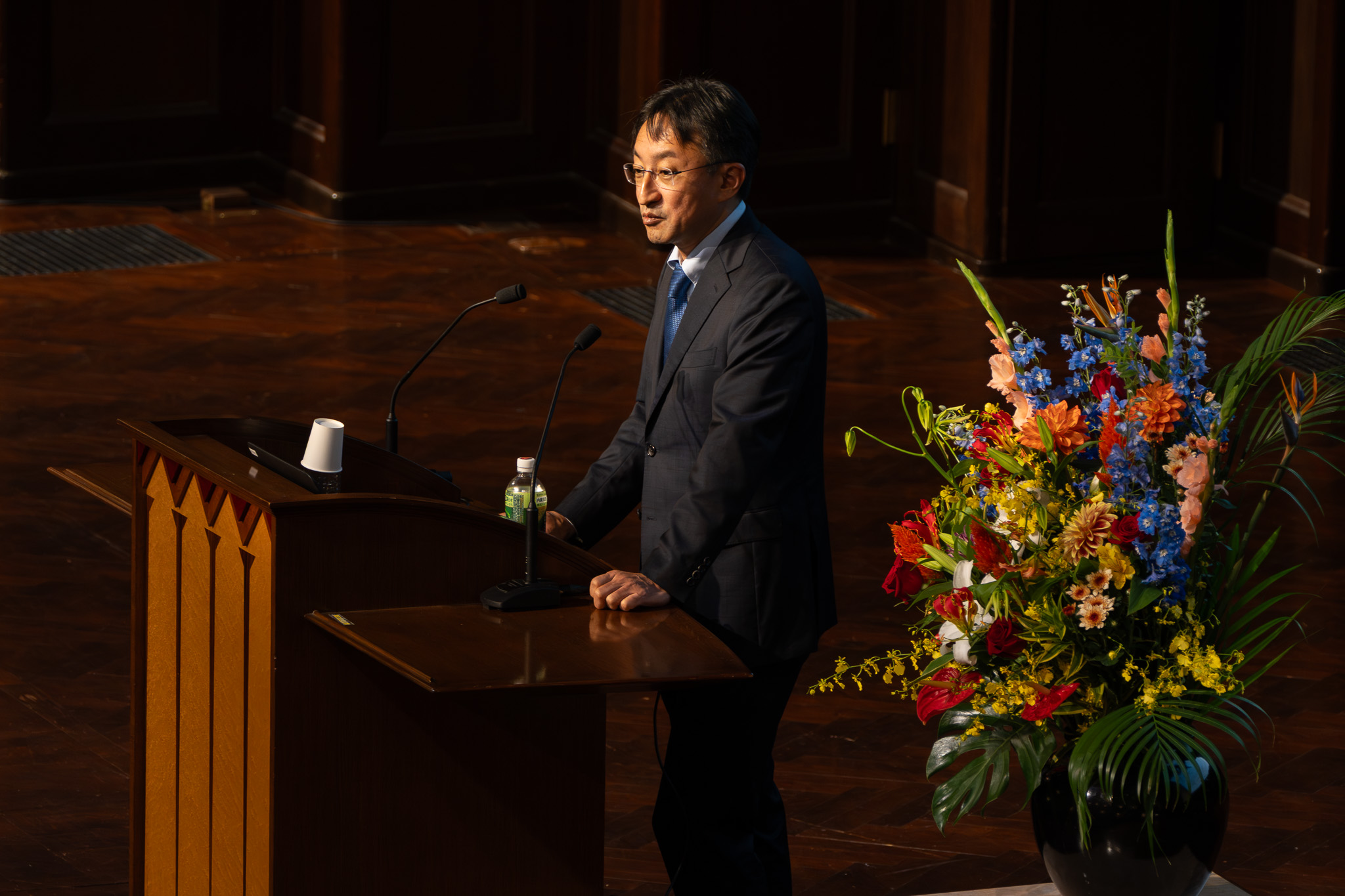 全国青年会の創立 30 周年を記念した歴代会長のメッセージ動画の放映に続き、基調講演として坂本会長が登壇しました。坂本会長は、組織変革を担うリーダーに求められる視点として「自らの変化から始める重要性」を強調し、全国青年会の先輩方への感謝とともに、未来を創るのは現在の青年会であると決意を表明しました。